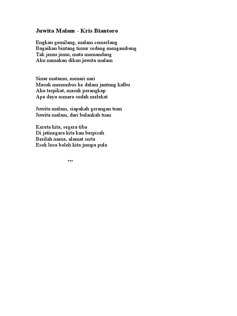 Tatap matamu bagai busur panah Yang kau lepaskan ke jantung hatiku Meski kau simpan cintamu masih Tetap nafasmu wangi hiasi suasana Saat kukecup manis bibirmu. Joseph Mohr memainkan gitar dan menyanyikannya bersama Franz Xaver Guber direktur paduan suara yang menuliskan melodinya. Original Soundtrack of BEBAN ASMARASinger by Rayyan Syahid dan Lilis Halisa Hamid M Nur Collection.